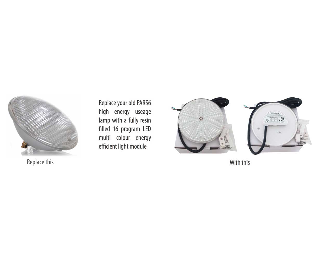 A fully resin filled PAR56 replacement LED light module. These modules are designed to replace the commonly found 178mm diameter PAR56 incandescent lamp found fitted in many pool light installations. Each light has 16 user selectable programs with 8 fixed colours and 8 colour changing programs all controlled by the existing light switch all built within the one light. Available with 546 or 630 LED’s. Fully resin filled to protect against leakage.